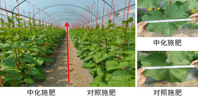 对照和试验组有差别,试验组的升蔓速度对照的要快,而且实验组的长势整齐。实验组部分哈密瓜植株已经开始出花,而对照组还并未出花。雅苒方案的叶面的宽度比对照方案宽、厚、绿。